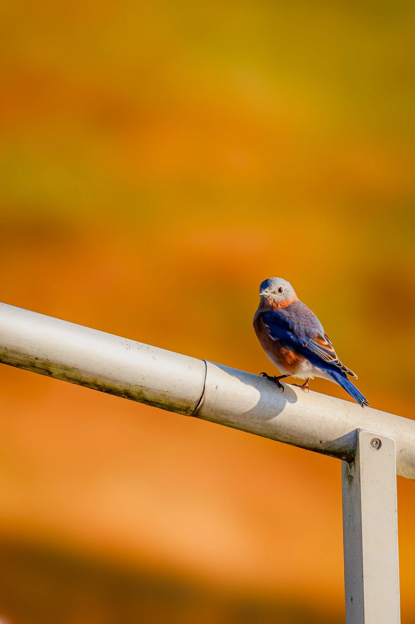 The eastern bluebird, with its vibrant blue plumage and rusty red breast, stands out beautifully against a backdrop bathed in golden hues. The warm tones of the setting sun create a soft, glowing contrast that highlights the bird's delicate features and sharp eyes. This combination of the bluebird’s vivid colors and the golden light evokes a serene and almost magical atmosphere, capturing a moment of natural elegance that speaks to the quiet beauty found in everyday wildlife scenes.